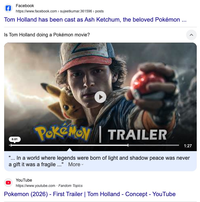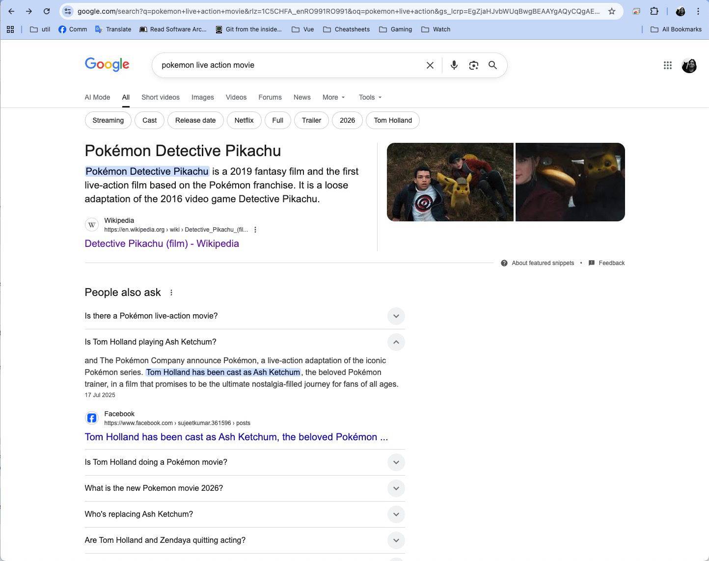 Primul rezultat e cel relevant, din punctul meu de vedere, fix ce mă interesa. Dar sub el, la întrebări adiacente (ca să le zic așa), ce îmi sare în ochi? Un film Pokemon nou cu Tom Holland în rolul lui Ash Ketchum?