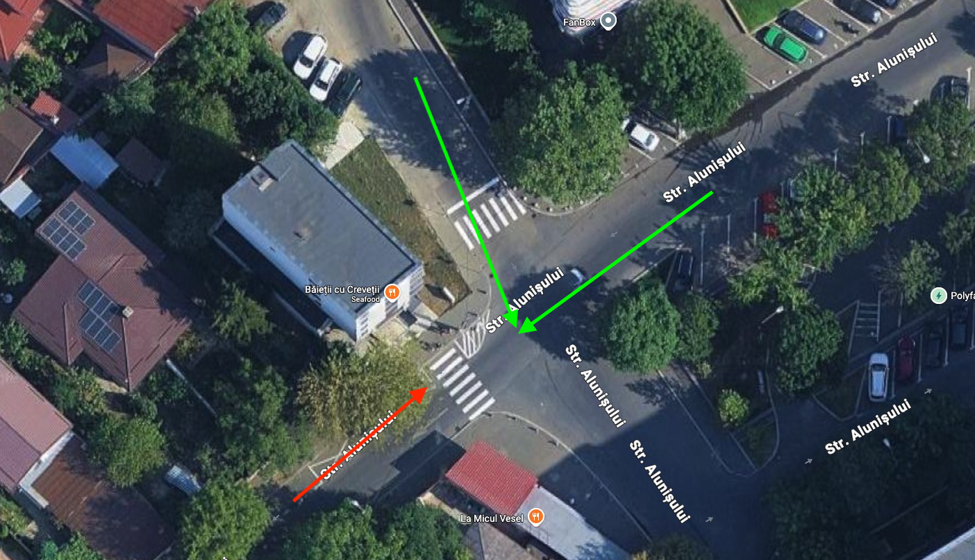 Cum era vineri seară, era ceva trafic și veneau mașini atât dinspre parc, cât și din lateral (am marcat sensurile cu săgeți verzi pe harta de mai jos). M-am oprit, am așteptat să pot traversa și într-un final s-a simțit un șofer să oprească. Mă uit la el, să fiu sigur că oprește (sunt pățit...), mă uit și în stânga, să nu iasă șoferi de acolo demarând dacă au văzut că s-au oprit mașinile (din nou, pățit). Pare totul ok, ridic mâna să salut șoferul cu bun simț care a oprit, pun piciorul pe trecere și...