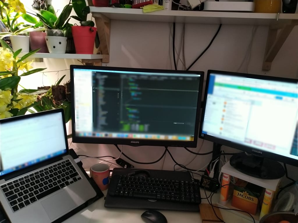 După ce am început să îmi pun la punct spațiul personal, am început cu un monitor Philips de 24 de inci (parcă), plus încă unul mai mic, în paralel cu laptop-ul, având două porturi video pe vechiul Macbook.