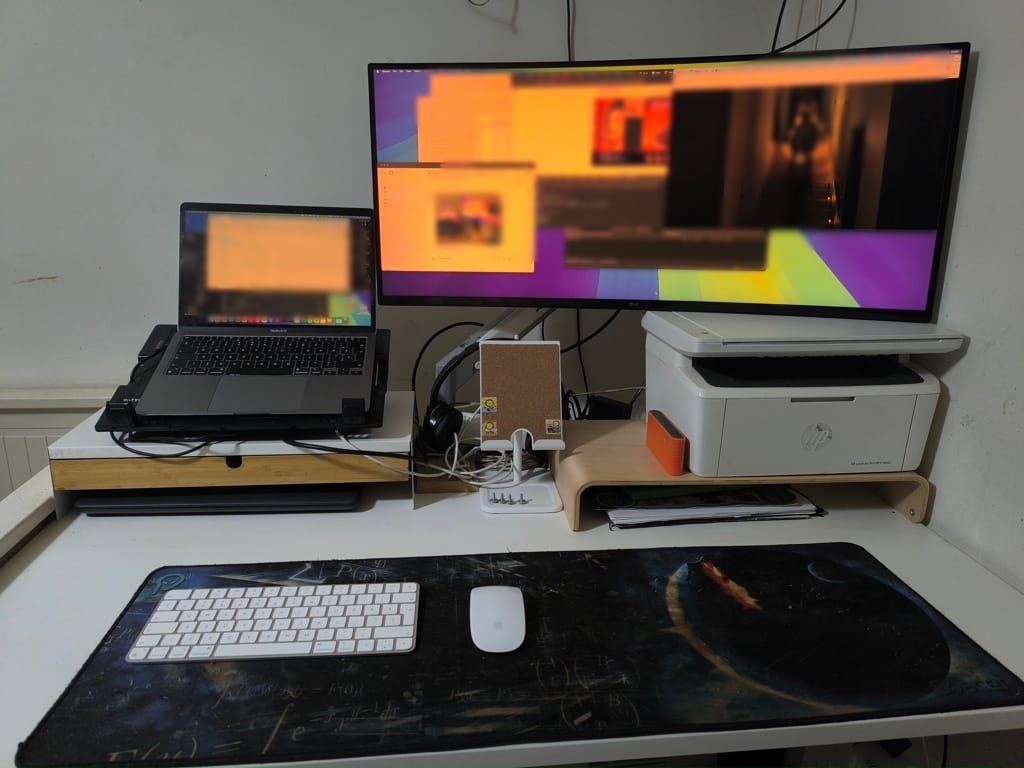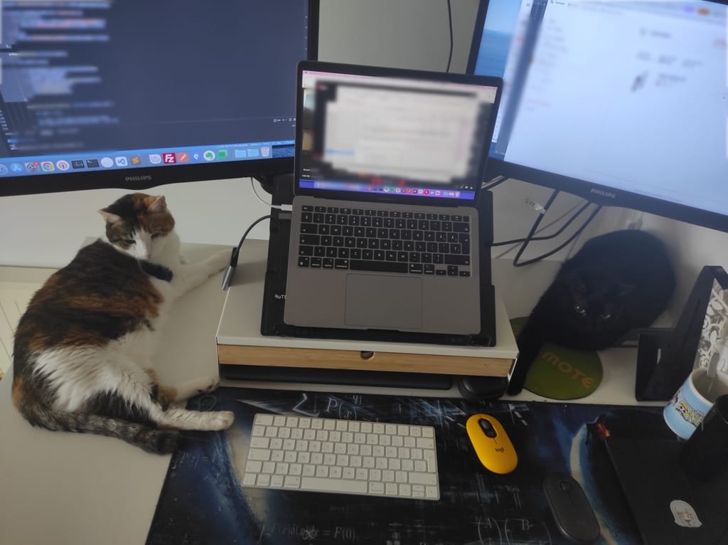 Laptop-ul încăpea frumos între ele, aveau loc și pisicile dedesubt, viața era frumoasă. Then the Fire Nation attacked! Pardon, am fost nevoit să trec la un nou Macbook, un Air de data asta, care nu mai suporta decât un monitor extern. Soluția finală? Un Ultrawide LG, despre care am mai povestit.