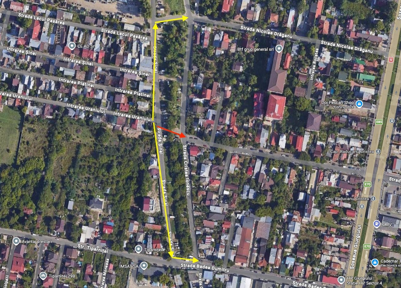 Vecinii dinspre strada Tiparniței rămăseseră totuși cu o cale de acces, marcată cu roșu în imaginea de mai jos. Dar în bunul spirit al primăriei care face lucrurile mai de rahat, relativ recent au închis-o și pe aceea. Iar acum oamenii din zonă care vor să iasă la șosea, la tramvai (unde, apropo, stația era fix la capătul străzii din continuarea săgeții roșii din hartă), acum sunt nevoiți să ocolească pe la capete. Deci nu doar că sunt niște sute de mers în plus, pe la capete iarăși nu sunt trotuare deci trec mașinile pe lângă tine.